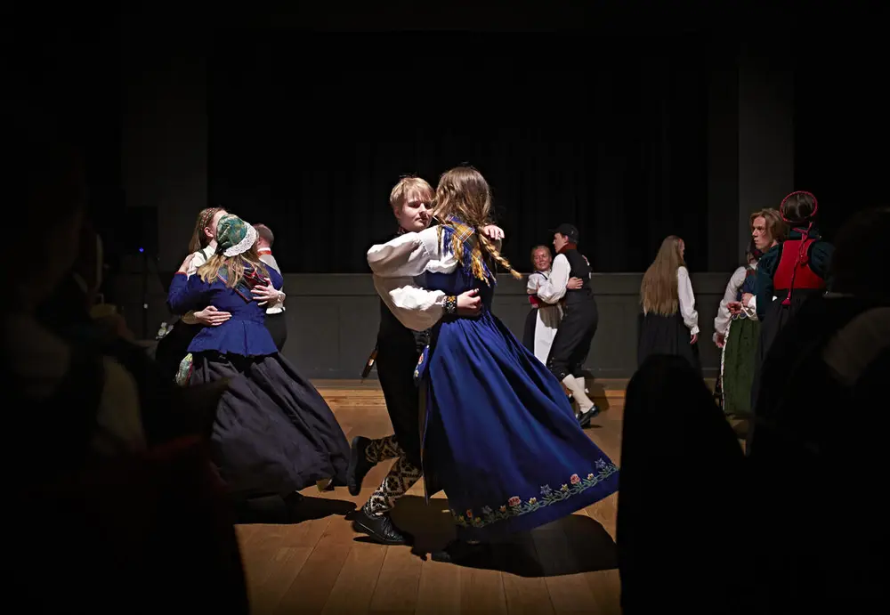 Folk dance performed by the dance group from Bondeungdomslaget. Photo: Geir Dokken/bunadbruk.no.